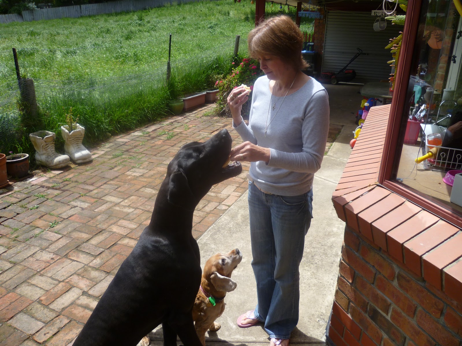Any guess what one she said I could have? That's right. The tiny little one second from top. Well, I must admit I was feeling hungry after smelling them cook and now I must confess. I tricked Mum. While they were cooling on the bench, she forget for a moment and when she turned around I had licked one of the biggest ones. Woops. I know that was naughty but I just couldn't help myself. Anyway Mum, says BRUCE, NO in a big voice and I backed off quickly. Well, I can hear her talking to the others saying, 'oh well, I may as well give it to him later, because it will go to waste otherwise and in 10 minutes he won't remember where it came from if I give it to him outside. Poor Mum. I think I fooled her. That was my plan all along.